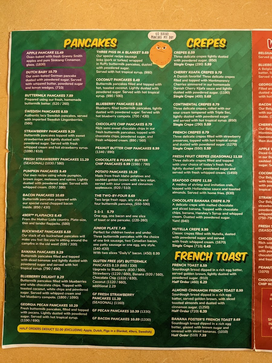 Start your morning with fluffy omelets such as the delectable Chocolate and Cheese or the hearty Seafood Omelet, topped with flavorful Hollandaise sauce. If you're in the mood for something sweet, the Almond Cinnamon French Toast and the indulgent Banana Foster's French Toast are must-tries.